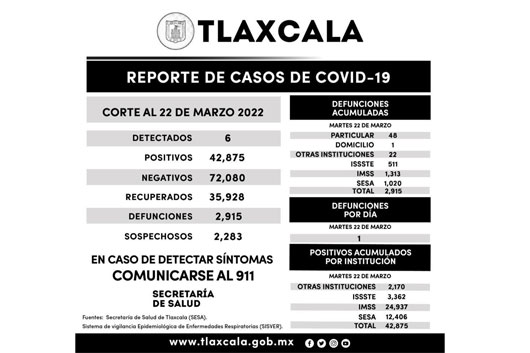 Registra SESA 260 casos positivos y cero defunciones de covid-19 en Tlaxcala