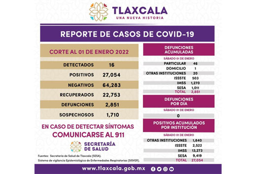 Los datos de la SESA registrados en la plataforma nacional del Sistema de Vigilancia Epidemiológica de Enfermedades Respiratorias (Sisver), confirmaron 16 casos positivos de Covid-19 y cero defunciones, el 01 de enero de 2022.