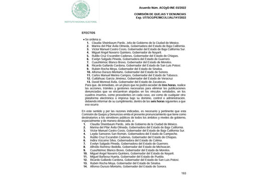 Ante ello, el INE dictó medidas cautelares a 13 titulares de los gobiernos de la CDMX, Baja California, Baja California Sur, Chiapas, Guerrero, Morelos, Nayarit, San Luis Potosí, Sinaloa, Sonora Tabasco, Veracruz y Zacatecas, por 48 publicaciones en sus redes sociales, al considerar que exaltan logros y acciones de gobierno que no están permitidos dentro de las excepciones que establece el marco normativo y constitucional, donde la gobernadora de Tlaxcala fue exenta de esos señalamientos.